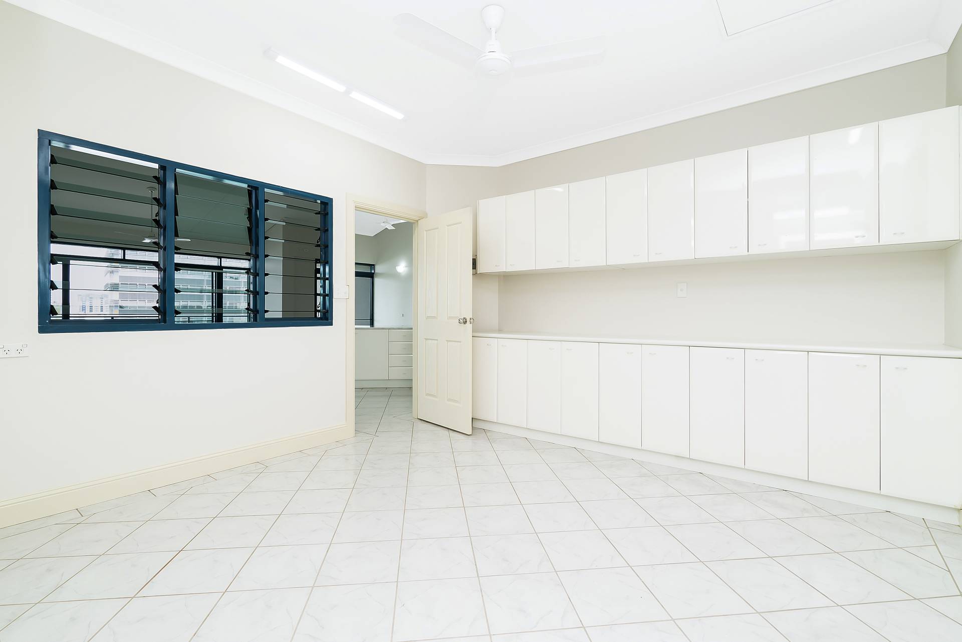 - Banks of louvre windows on two sides of the study, handy built-in cupboards