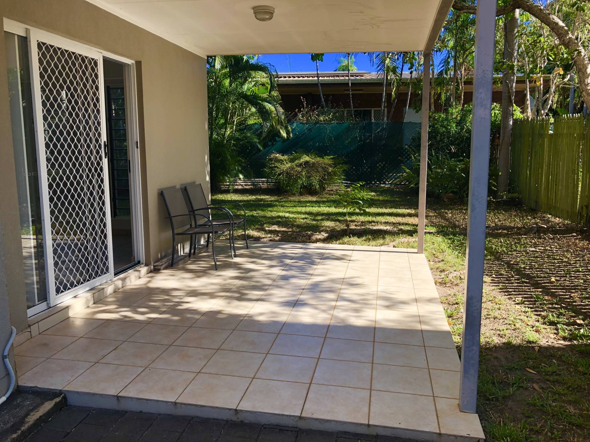 - The outside includes a fenced lawn area and undercover entertaining area