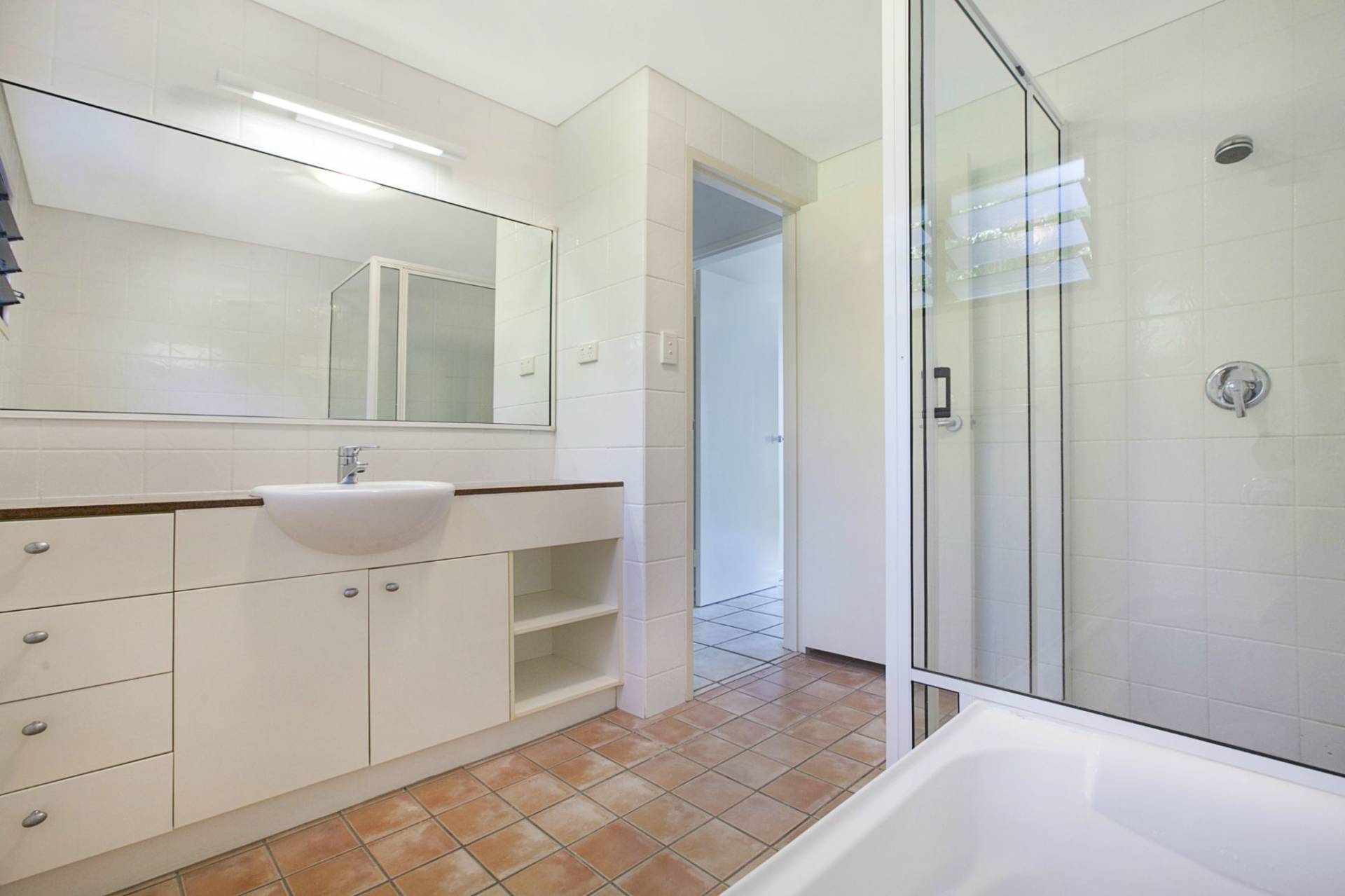 - The gleaming white main bathroom comes with both a shower and a bath