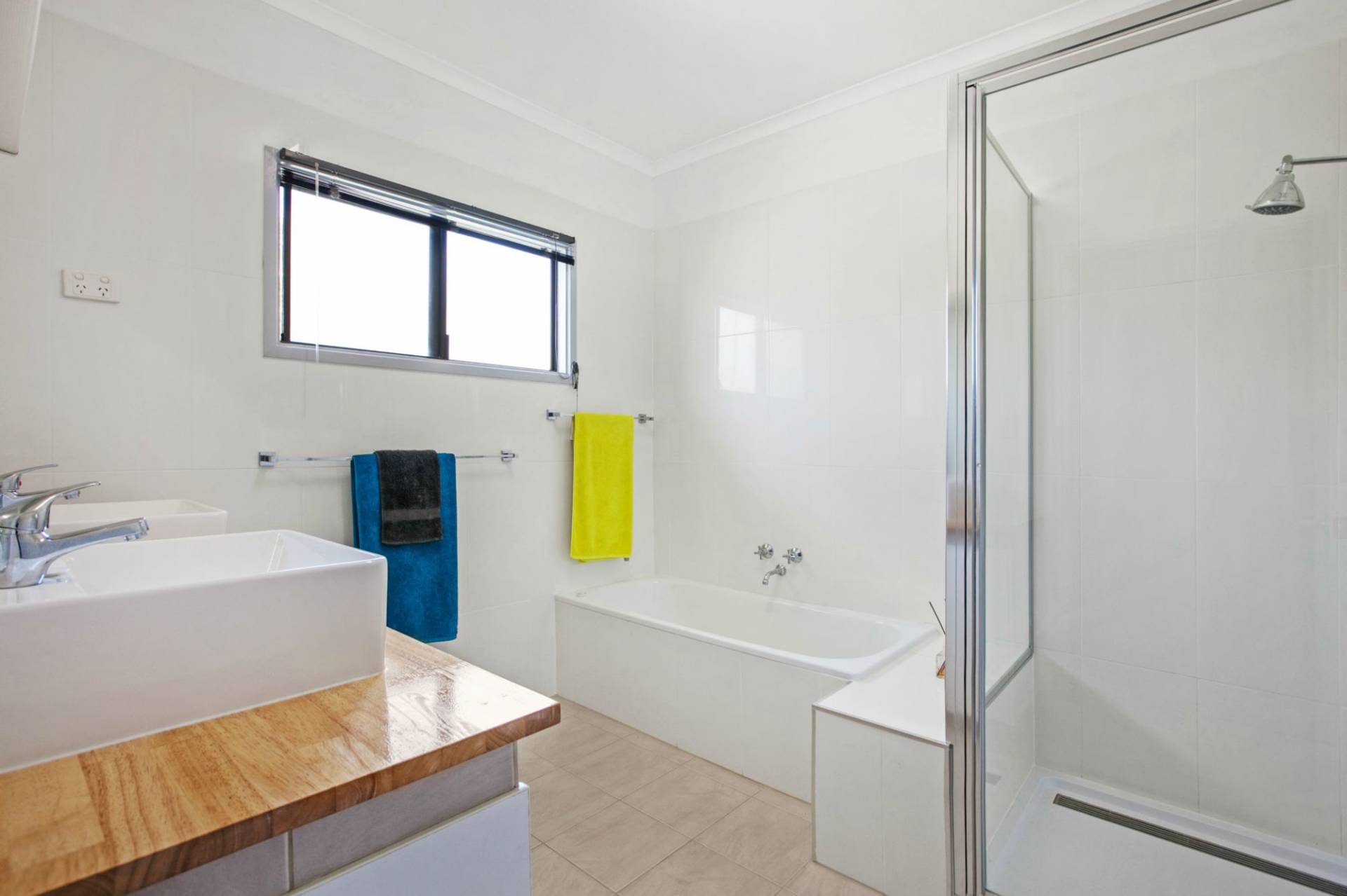 - The gleaming renovated bathroom includes dual hand basins